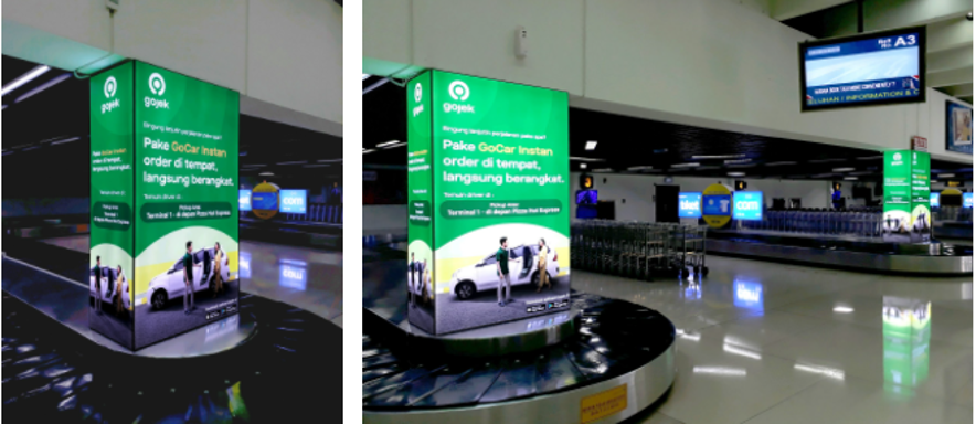 In the execution of Gojek advertisements, The Perfect Media uses 16 units of pillar lightbox media which are installed exclusively in the baggage claim area of Terminal 1A and 1B Soekarno-Hatta International Airport.