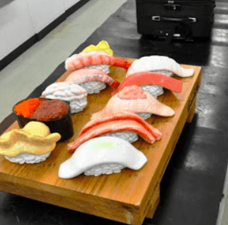 [In an effort to boost tourism,] a fake Toyama Bay-style sushi set (Giant plates of fake sushi–red queen crab, white shrimp and yellow tail among them – YUM) takes a ride on the baggage carousel at Toyama Airport. Set on the baggage carousel, the imagery is an offshoot of the ubiquitous rotating sushi bar, pieces of Japan’s famed cuisine ridding with other pieces of baggage! Other airports in Japan feature huge replicas of other food or even manga characters in the hopes that these local specialties will bring more tourists to these areas
