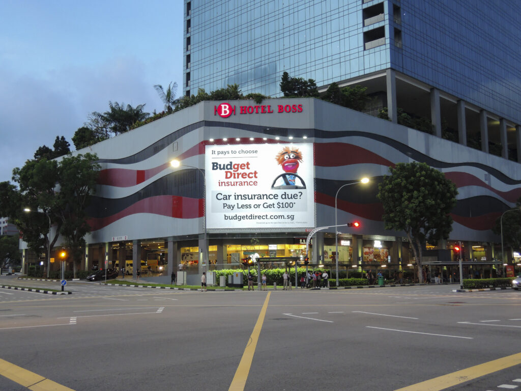 Prominently displayed billboard on the front façade wall of Hotel Boss at Lavender area, this strategic location is facing a busy cross junction turning into Victoria St, Kallang or CBD area, making this another great location for Budget Direct to advertise their services. It is within close proximity to Bugis Junction, Little India and Arab Street eateries and café where traffic is always on the move 24/7. The billboard is hard to miss as it is even well-lit at night.