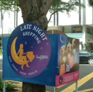 The current campaign for the “Friday Late Night Shopping At Orchard Road” has stepped up a notch with more intensive outdoor advertising on the street. No media buying for the Uniquely Singapore, instead they rely on their “immunity” from the authorities (waiver to use public goods for promotion of goverment related messages” to use the pedestrian walkways and wrap-around stands on the streetscape trees for their outdoor advertising messages.