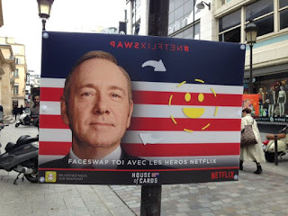 it was an “interesting, offline-social combination” that …”allowed latest out-of-home campaign lets Snapchat users in France swap faces with its TV characters including House of Cards’ Frank Underwood and the namesake of Unbreakable Kimmy Schmidt. Bringing outdoor ads together with Snapchat seems to be a growing phenomenon, with the mobile app itself leading the way. In late March, Snapchat debuted smart, stealthy roadside ads in several cities. And last week, it bought a huge, digital ad on a Times Square billboard”