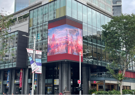 The sweet spot for viewing 3D creatives on this screen is right at the junction in front of H&M’s flagship store on Orchard Road. The Heeren screen gets a captive audience from shoppers waiting to cross the road towards and from Takashimaya (313@Somerset), especially from 6 p.m. onwards when the brightly lit LED screen easily captivates passersby.
